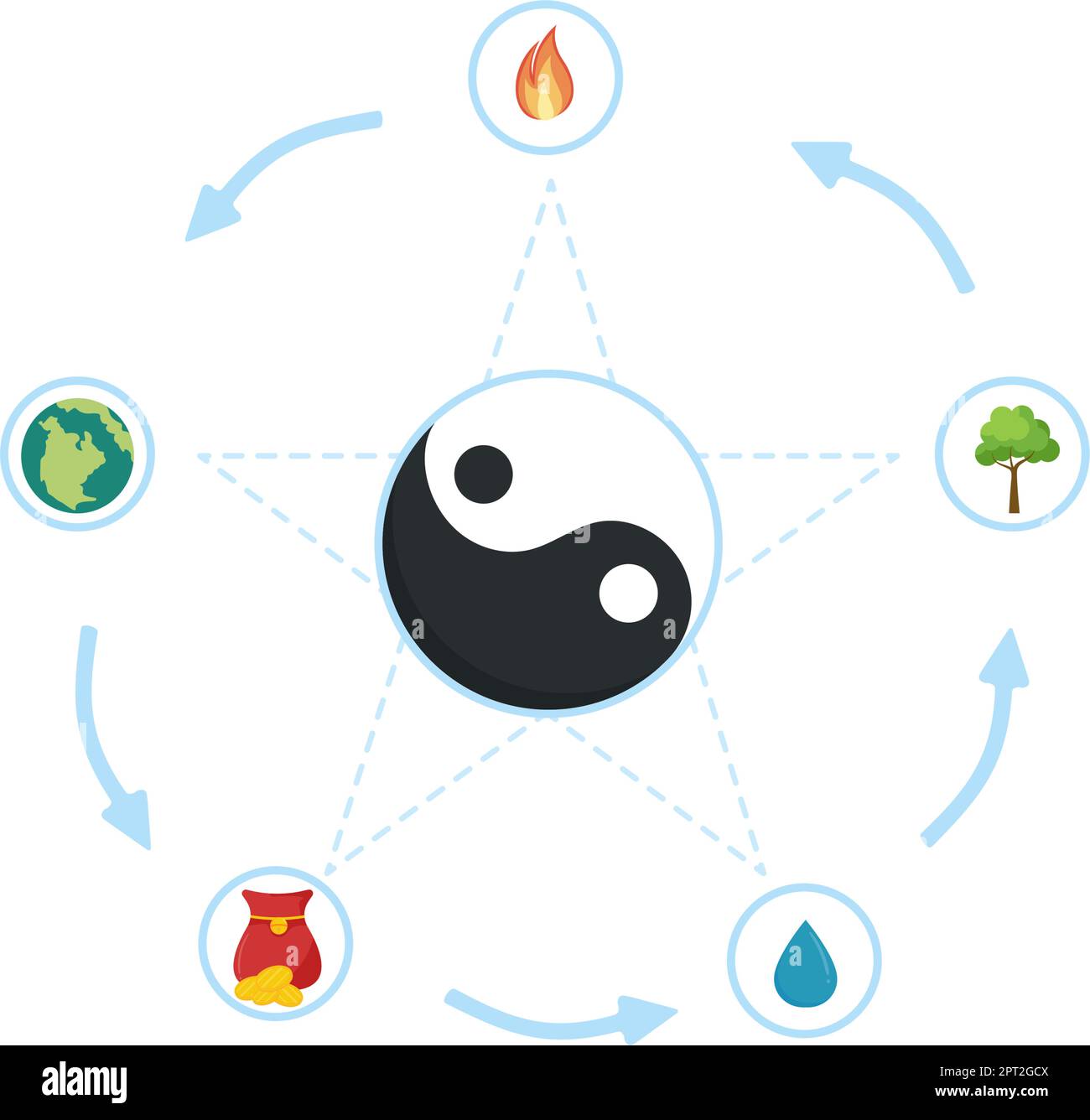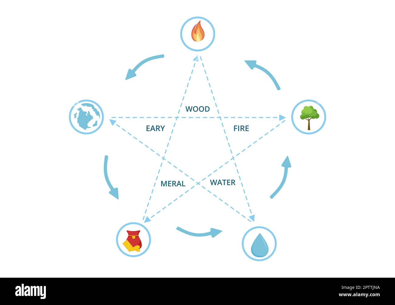 Feng Shui 5 Elements of Nature in Circles Connected by Lines with Water, Wood, Fire, Earth, Metal in Flat Cartoon Hand Drawn Templates Illustration Stock Photo - Alamy