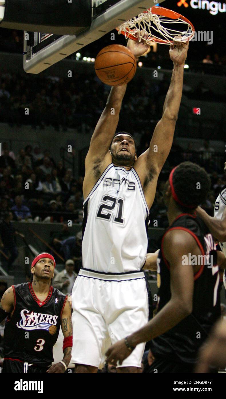 Philadelphia 76ers guard Allen Iverson (3) watches as San Antonio Spurs forward Tim Duncan (21) dunks during the second quarter in San Antonio, Wednesday, Dec. 1, 2004. (AP Photo/Eric Gay Stock Photo - Alamy