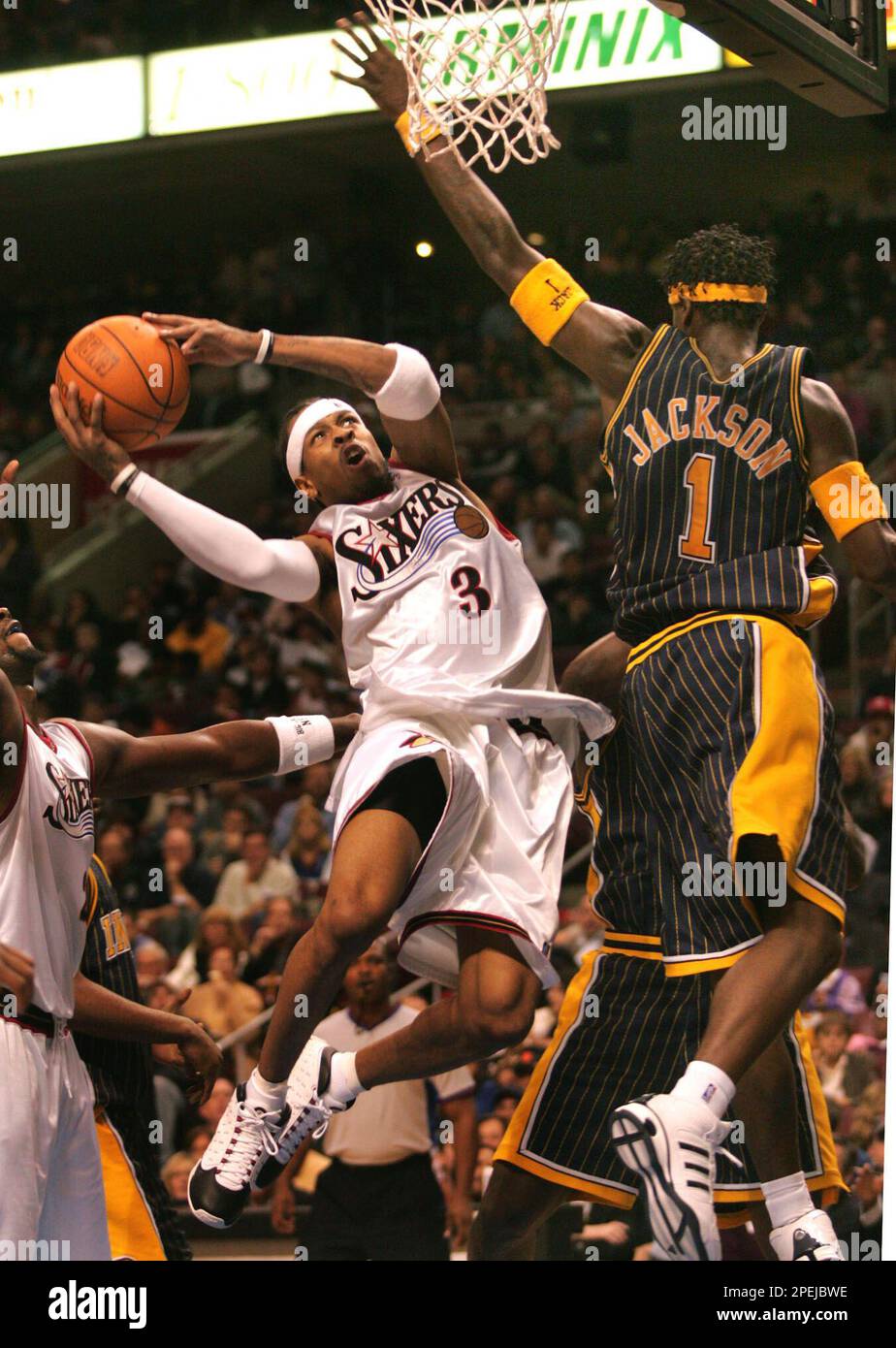 Allen Iverson of the Philadelphia 76ers attempts a layup against the Indiana Pacers played at Market Squar… | Indianapolis indiana, Indianapolis, Philadelphia 76ers