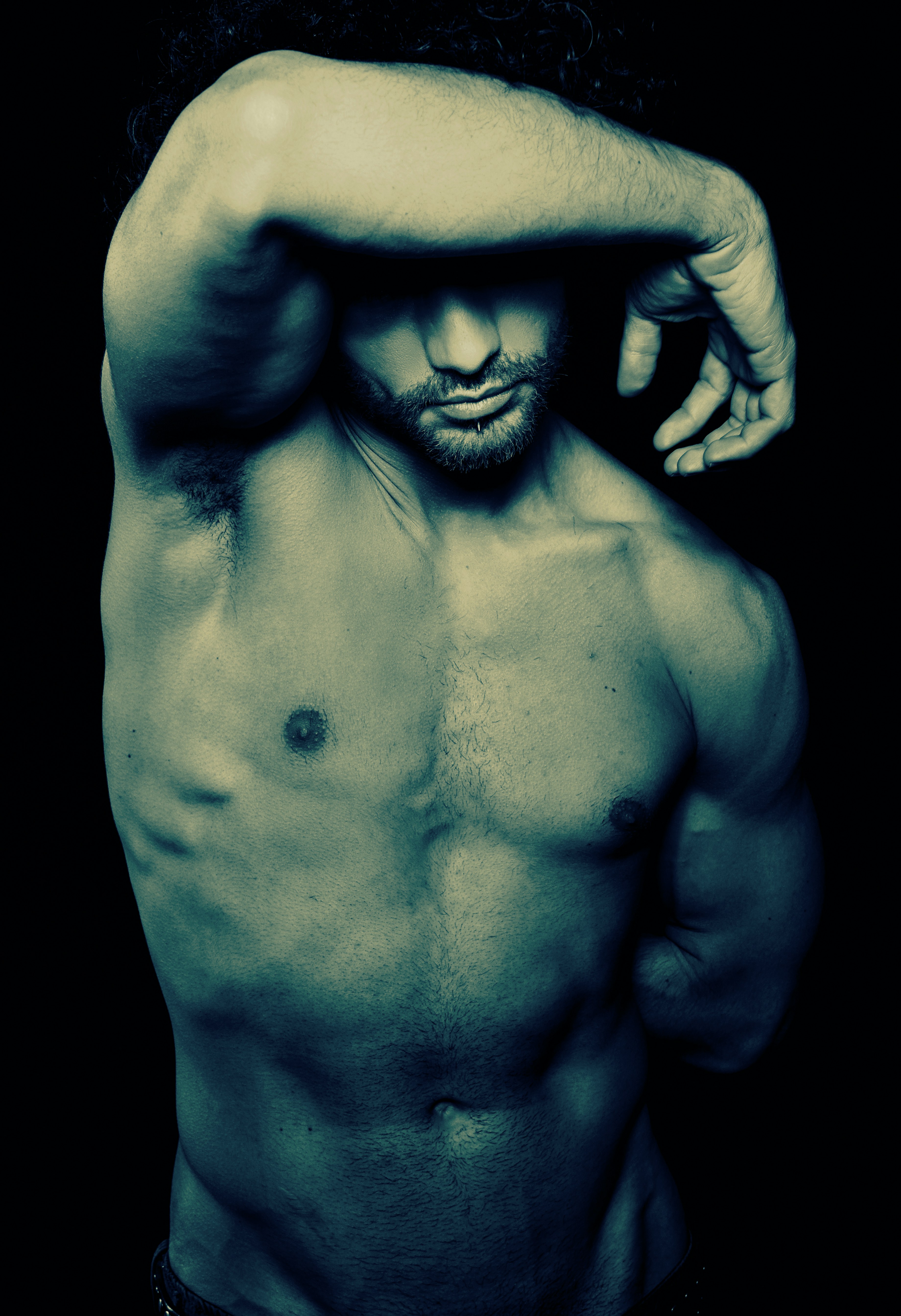 Premium Photo | Awesome man with tattoos posing in shadows over black background.