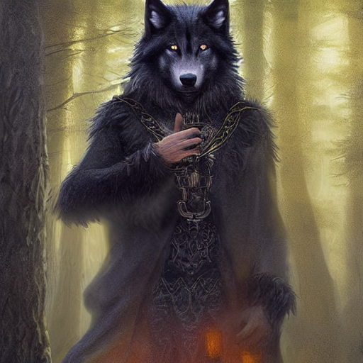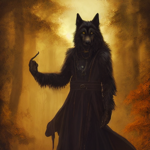 Prompthunt: furry anthro digital art of an anthropomorphic fluffy black wolf magician sorcerer man wearing a yellow cloak standing in the forest hands on his hips Greg Rutkowski masterpiece portrait