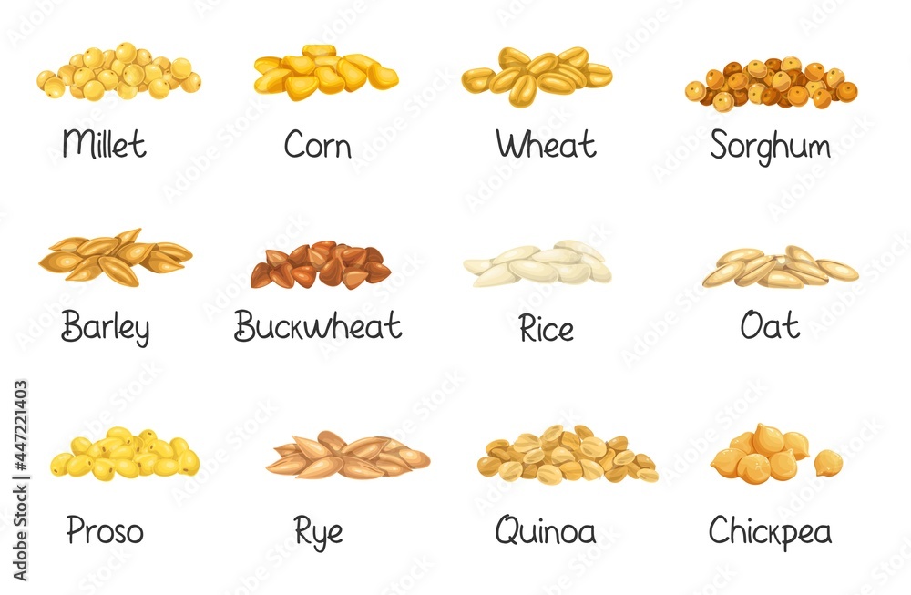Cereal grains. Different seeds and crops. Organic corn, spelt, rice and buckwheat, healthy natural products, porridge main ingredients, nutrition Stock Vector Image & Art - Alamy