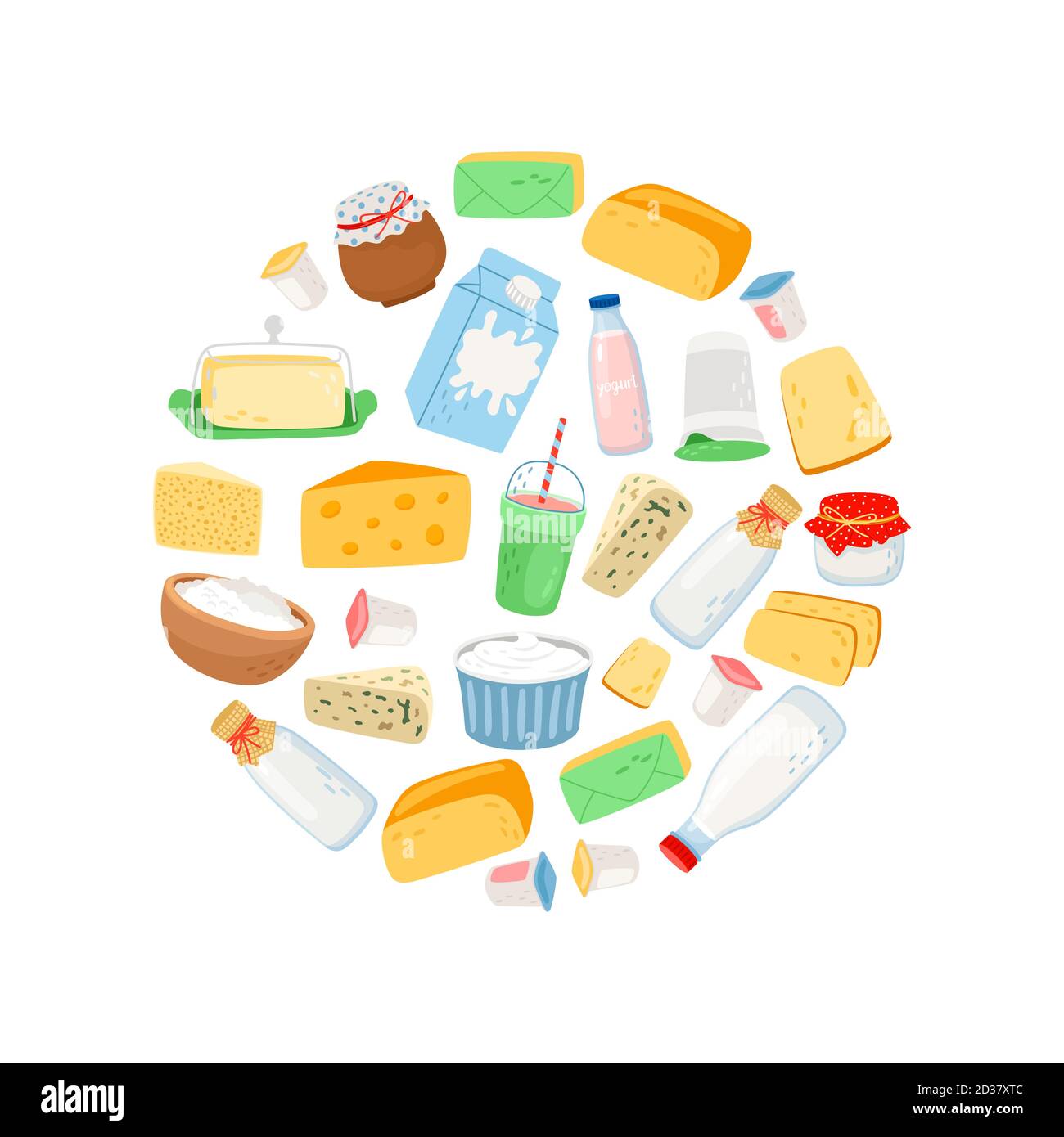 Food illustration. Vector flat design of different dairy products group of symbol in circle frame isolated on white background. Stock Vector | Adobe Stock