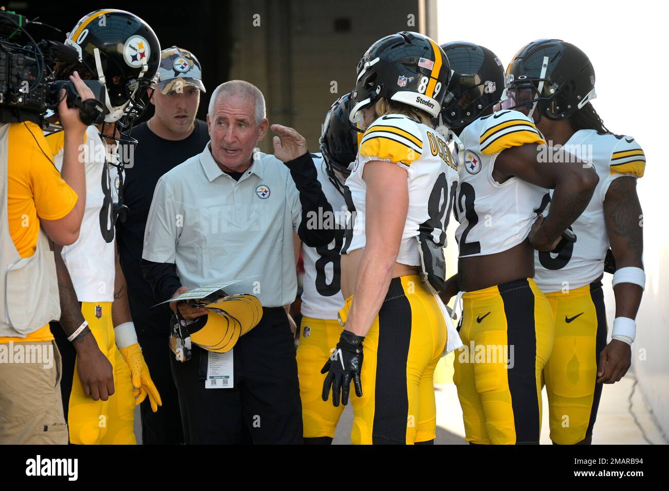 Pittsburgh Steelers special teams coordinator Danny Smith huddles with players in the tunnel before a preseason NFL football game against the Jacksonville Jaguars, Saturday, Aug. 20, 2022, in Jacksonville, Fla. (AP Photo/Phelan
