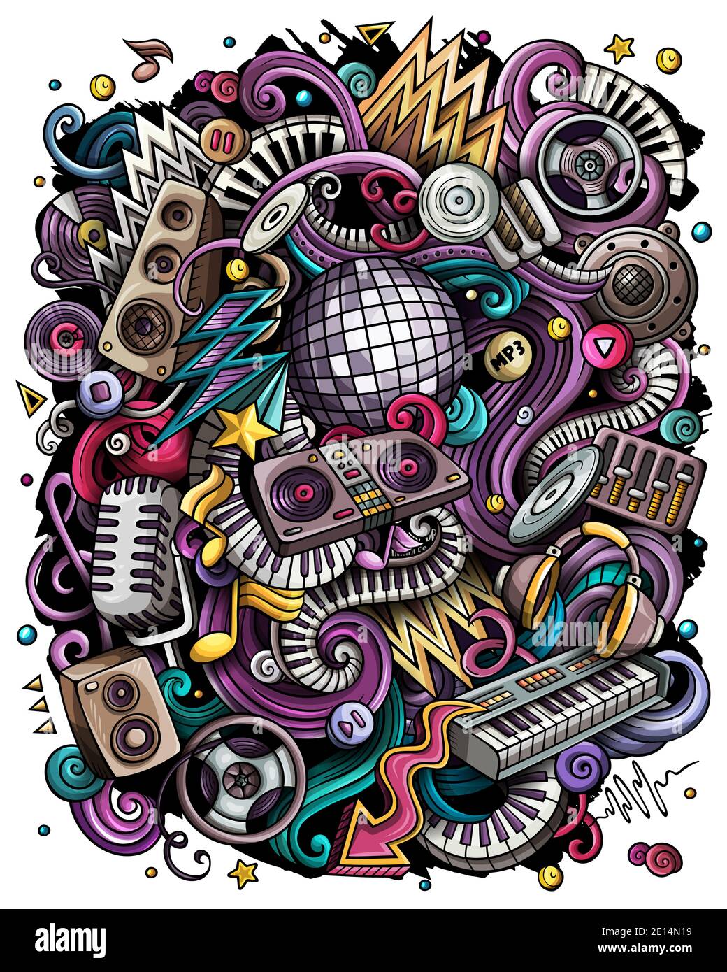 Cartoon raster doodles Disco music illustration. Bright colors musical picture Stock Photo - Alamy