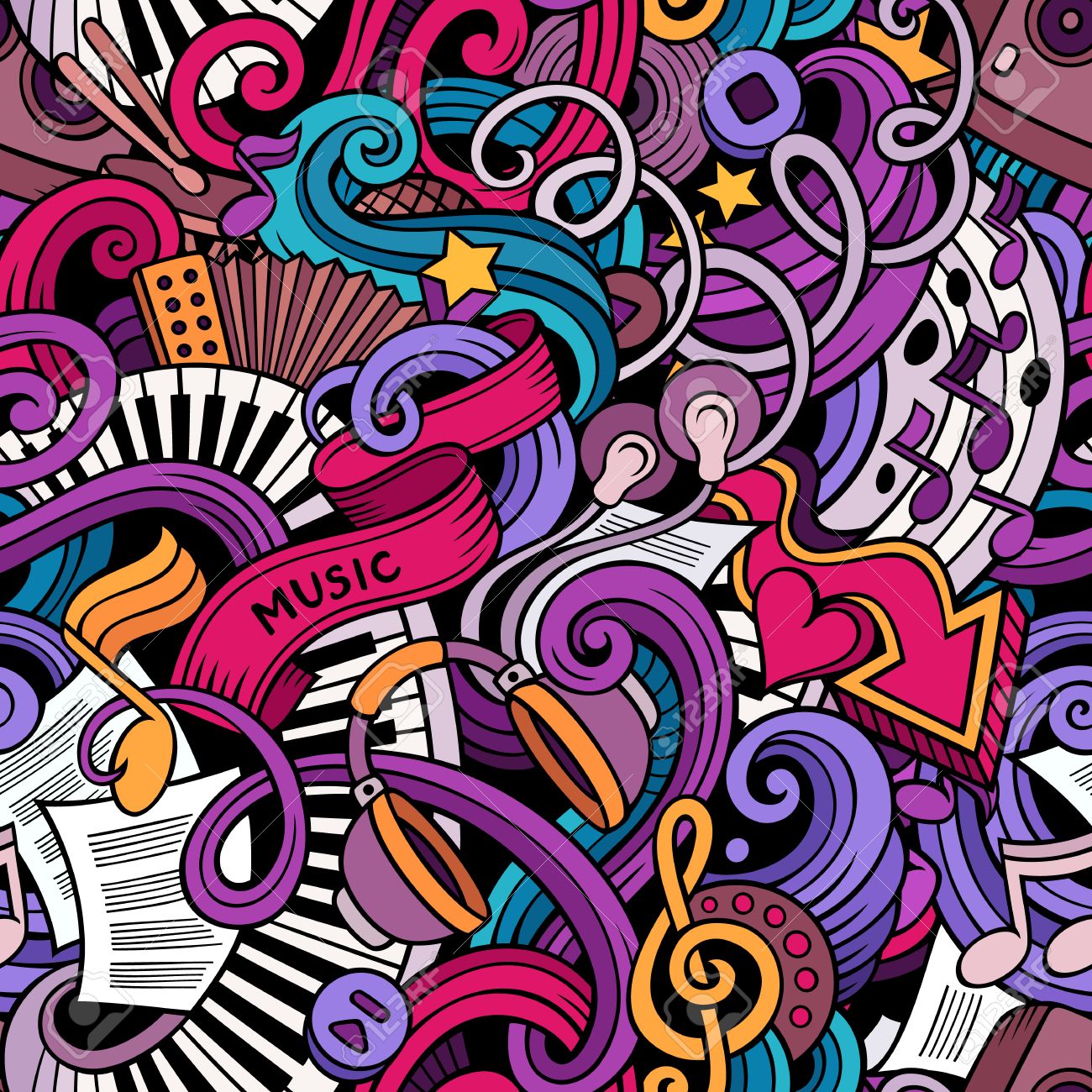 Cartoon Hand-drawn Doodles On The Subject Of Music Style Theme Seamless Pattern. Vector Color Background Royalty Free SVG, Cliparts, Vectors, and Stock Illustration. Image 49422105.