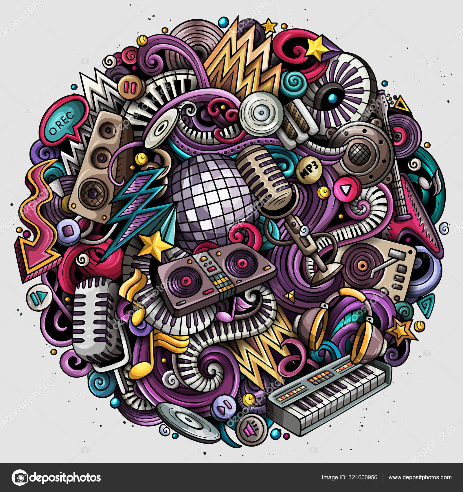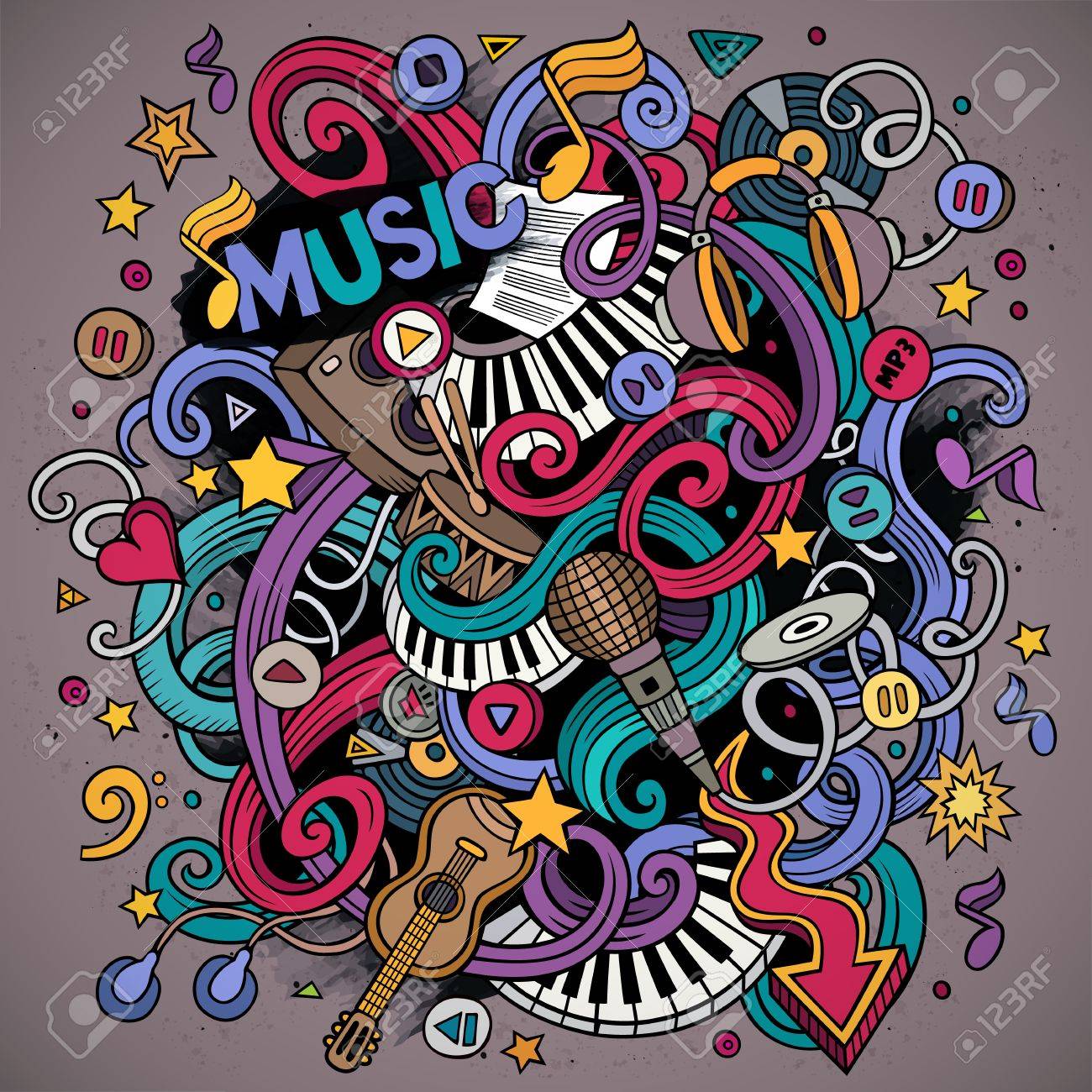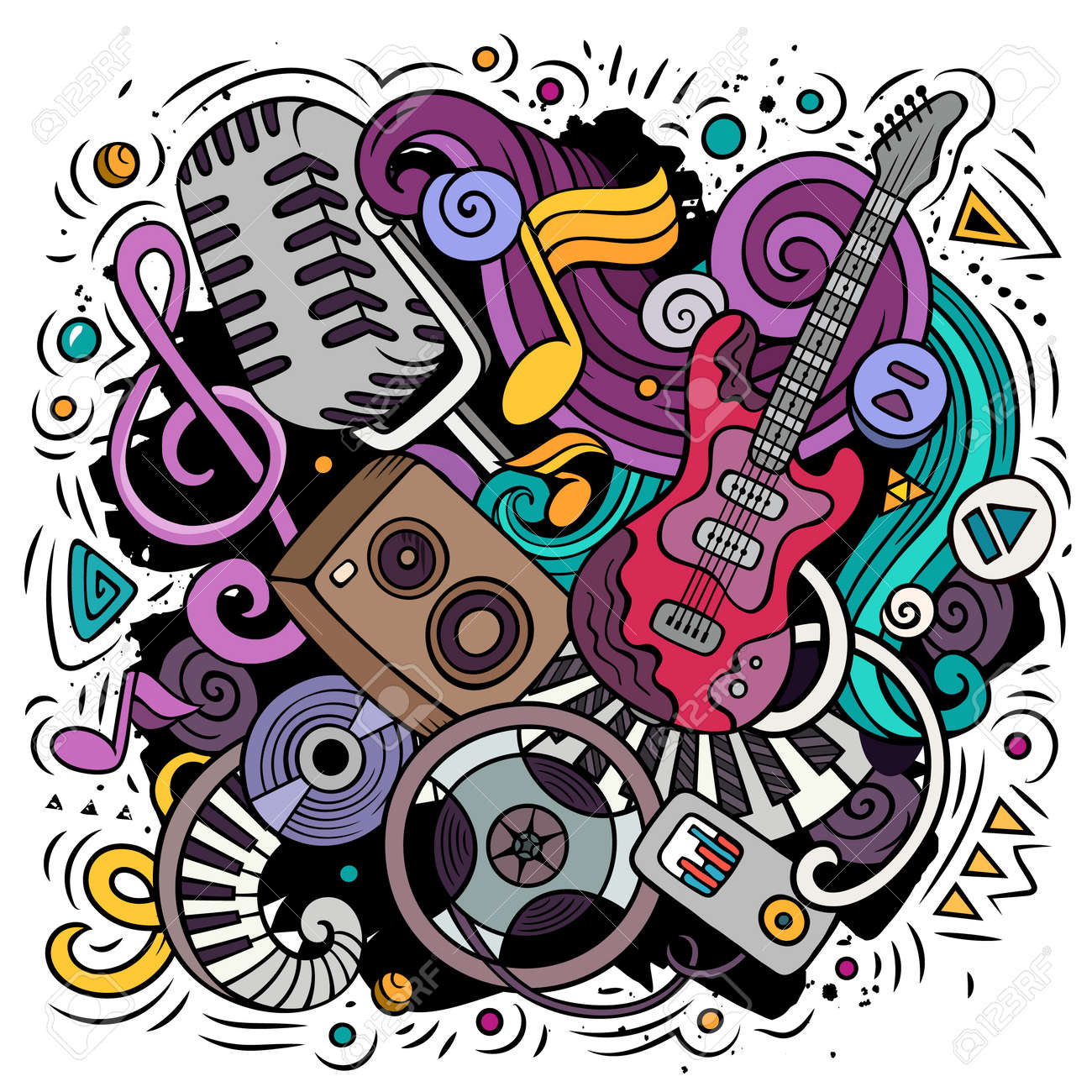 Cartoon Hand-drawn Doodles Musical Illustration. Colorful Detailed, With Lots Of Objects Vector Background Royalty Free SVG, Cliparts, Vectors, and Stock Illustration. Image 55588474.