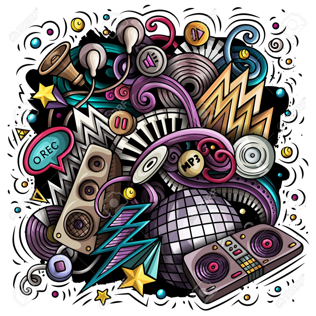 Cartoon Vector Doodles Disco Music Illustration. Colorful, Detailed, With Lots Of Objects Background. All Objects Separate. Bright Colors Musical Funny Picture Royalty Free SVG, Cliparts, Vectors, And Stock Illustration. Image 166003745.