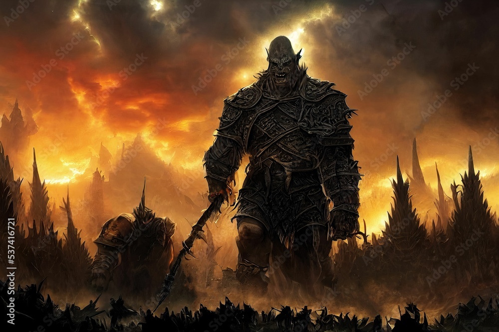 Fantasy battle war illustration art digital artwork dark sci-fi epic scifi orcs elves army soldiers demons background wallpaper backdrop scene world horror eery atmospheric hord weapons Stock Illustration | Adobe Stock