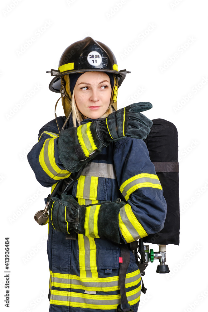 Young caucasian woman in uniform of fireman posing in profile with Air Tank on her back and pointing away isolated on white background Stock Photo | Adobe Stock