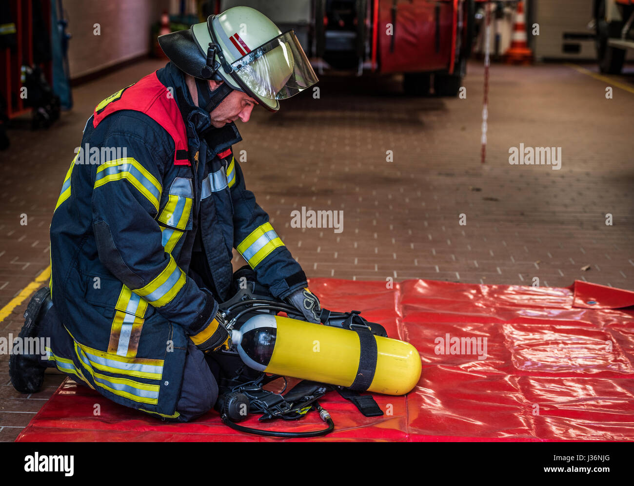 Firefighter with breathing air bottles on his back, Berlin, Germany Stock Photo - Alamy