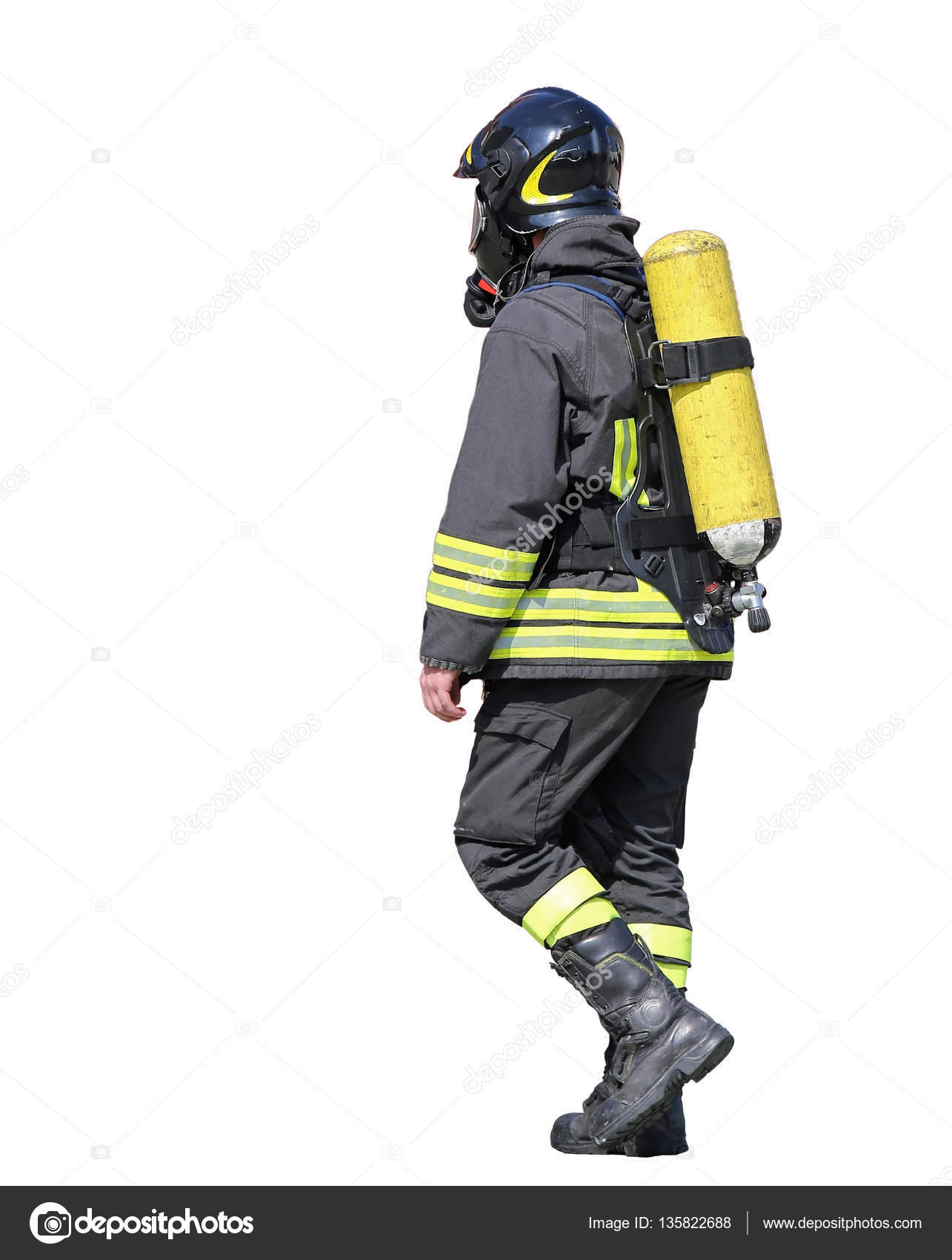 Rear view of full body walking firefighter in fire-proof uniform and hardhat with air tank on his back and axe isolated on white background isolated. Stock Photo | Adobe Stock