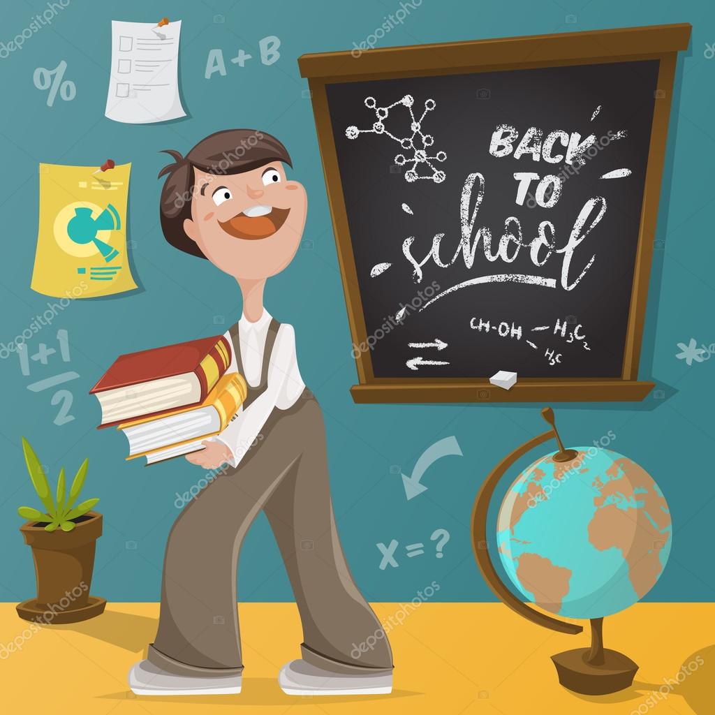 Back to school. Schoolboy, chalkboard and school supplies. Funny cartoon character. Vector illustration Stock Vector by ©kateja 117372174