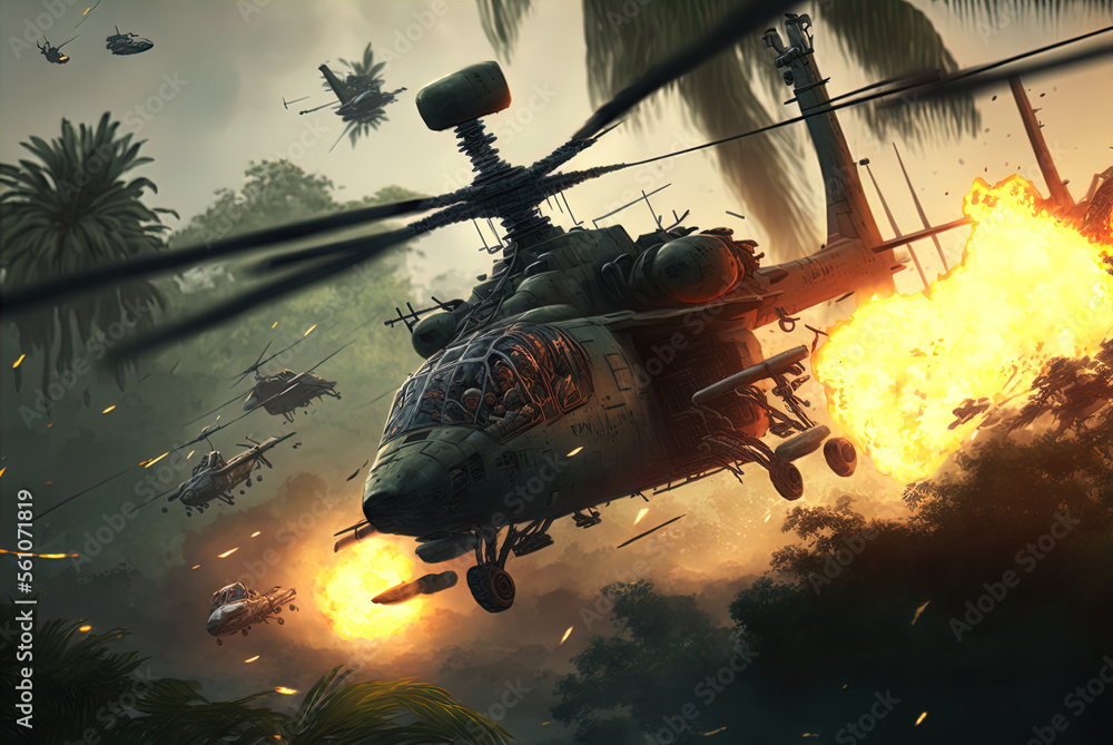 Hovering U.S. Army helicopters pour machine gun fire into tree line to cover the advance of South Vietnamese ground troops in an attack on a Viet Cong camp 18 miles north of
