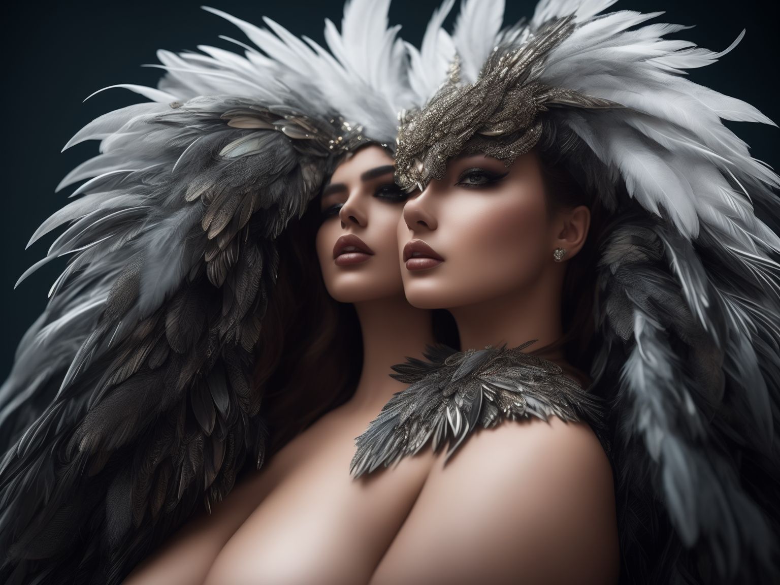 Dnbcd: Full body photo, Cinematic, 10k Resolution, fully exposed yet covered in feathers, Thicc woman, she is half bird half human with wings, feathers for clothing, Intricate details, Centered, Beautiful, Ultra detailed,