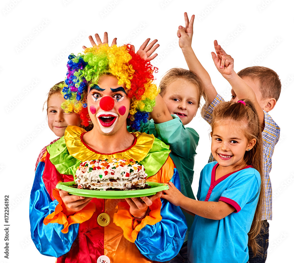 Birthday children clown eating cake with kids together. Celebratory cake on a plate. Fun happy childhood of small group people. Children play with clown. Stock Photo | Adobe Stock