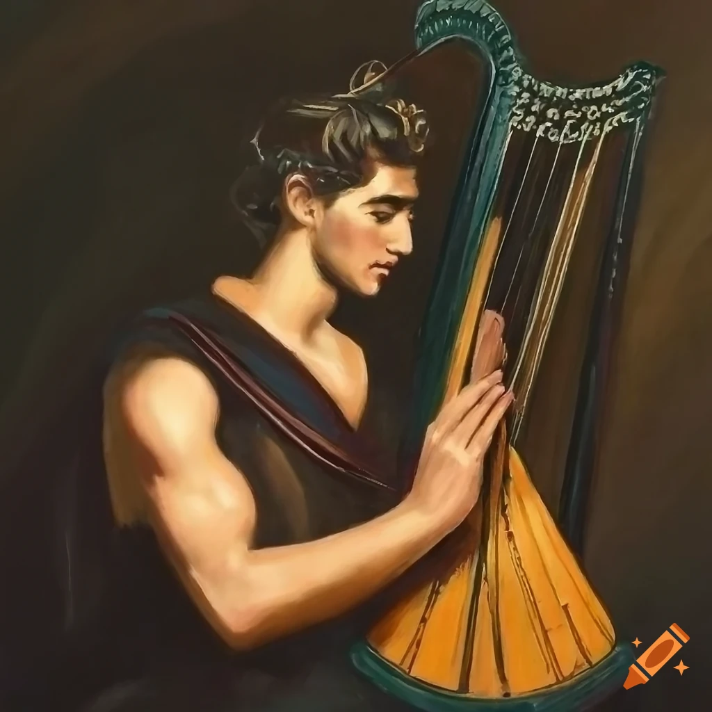 Orpheus, young male greek warrior holding a greek harp, impressionist style art painting on Craiyon