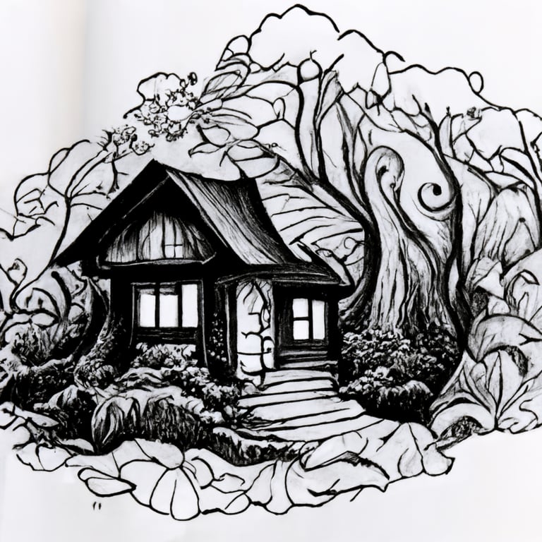 Prompthunt: black and white outline coloring page with detailed curls and waves, no color, no shade, hand drawn line, fairy house in the forest, butterly, cheerful whimsical feeling