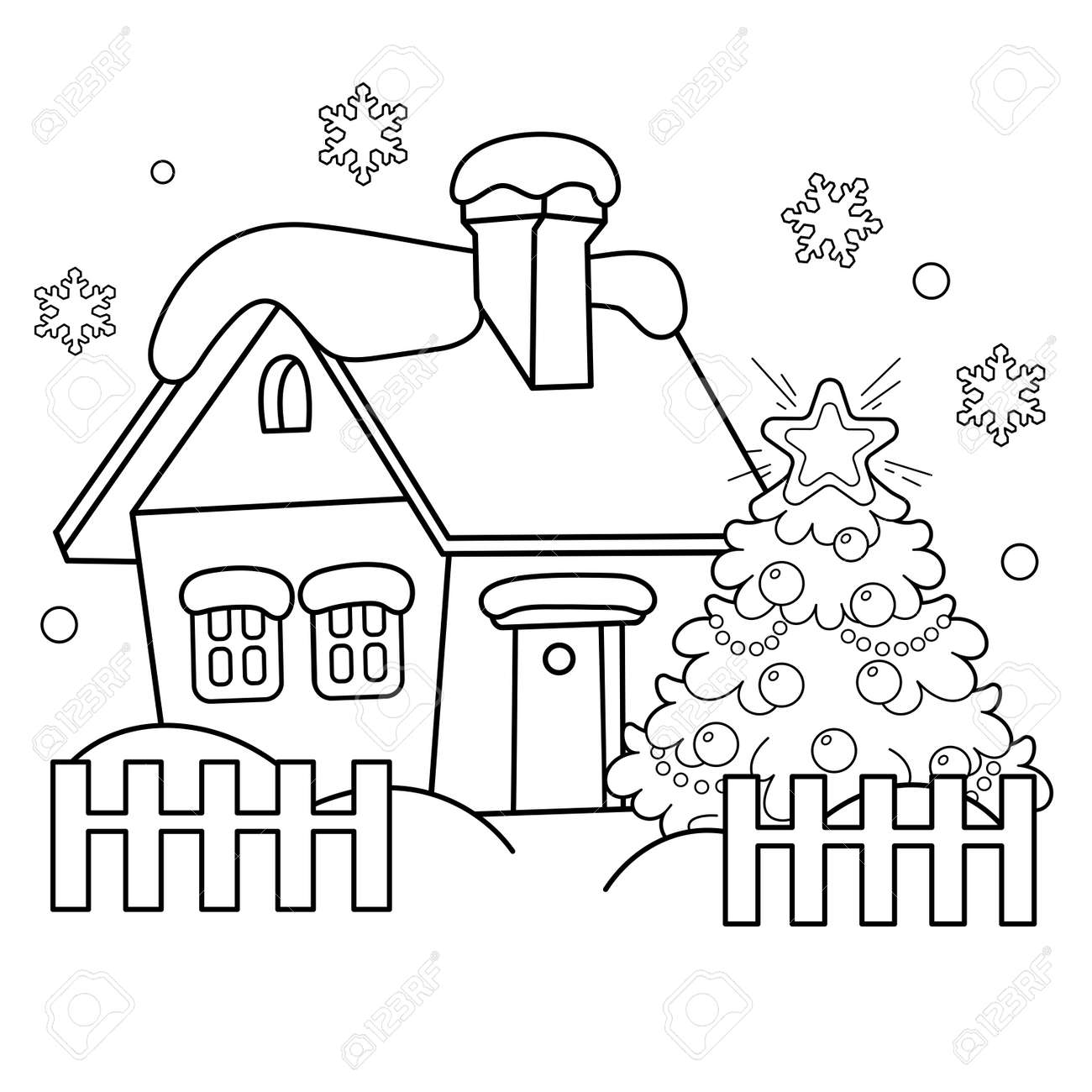 Coloring Page Outline Of Snow-covered House With Christmas Tree. Winter. New Year. Christmas. Coloring Book For Kids Royalty Free SVG, Cliparts, Vectors, and Stock Illustration. Image 175615729.