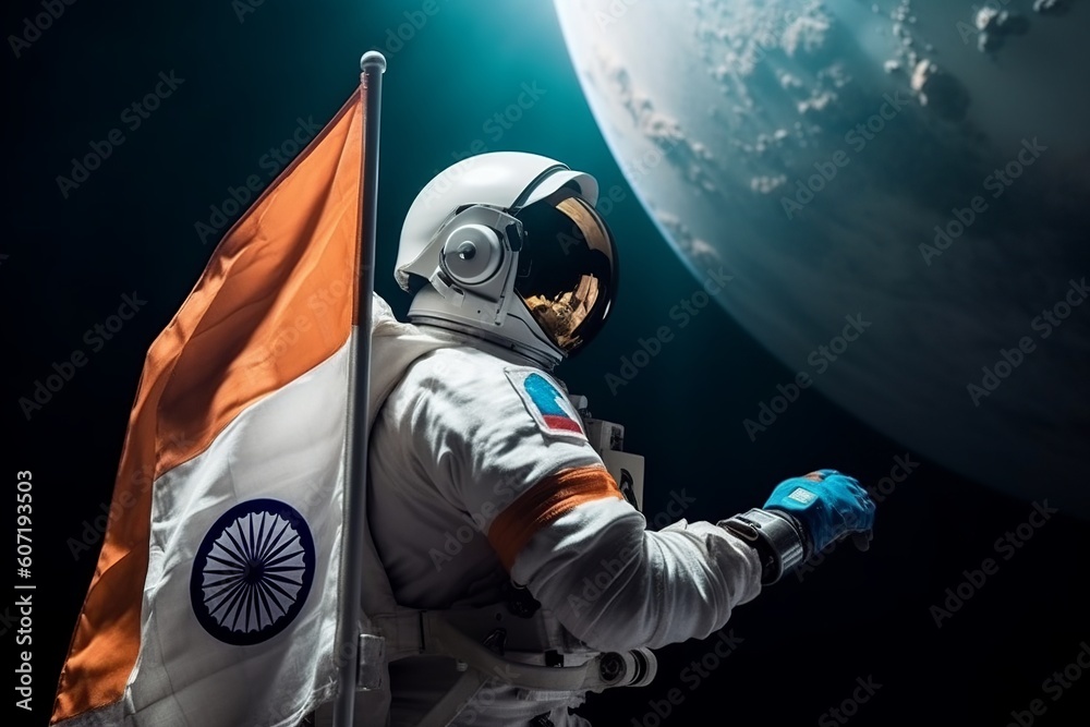Indian astronaut holding an India flag in a space exploration mission, asian technology, generative AI Stock Illustration | Adobe Stock