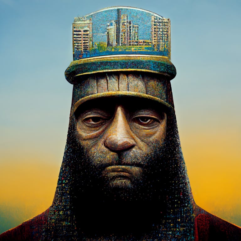 Prompthunt: realistic portrait of king hammurabi in Babylon city in background