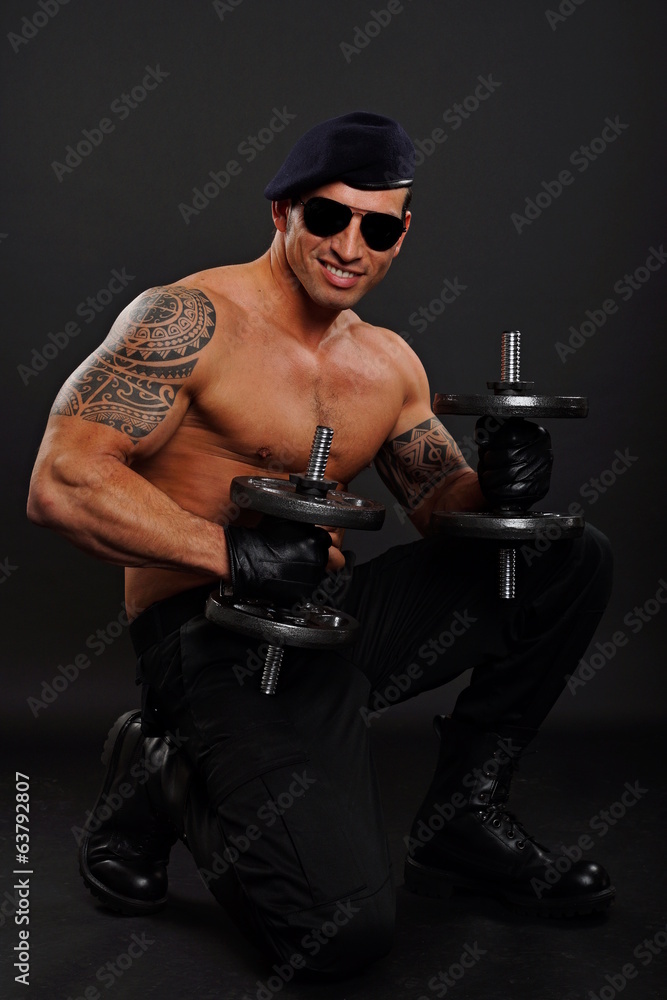 Muscular soldier kneeling on one knee posing with dumbbells Stock Photo | Adobe Stock