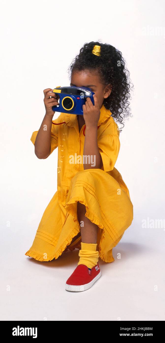 Girl kneeling on one knee holding a camera to her eye Stock Photo - Alamy