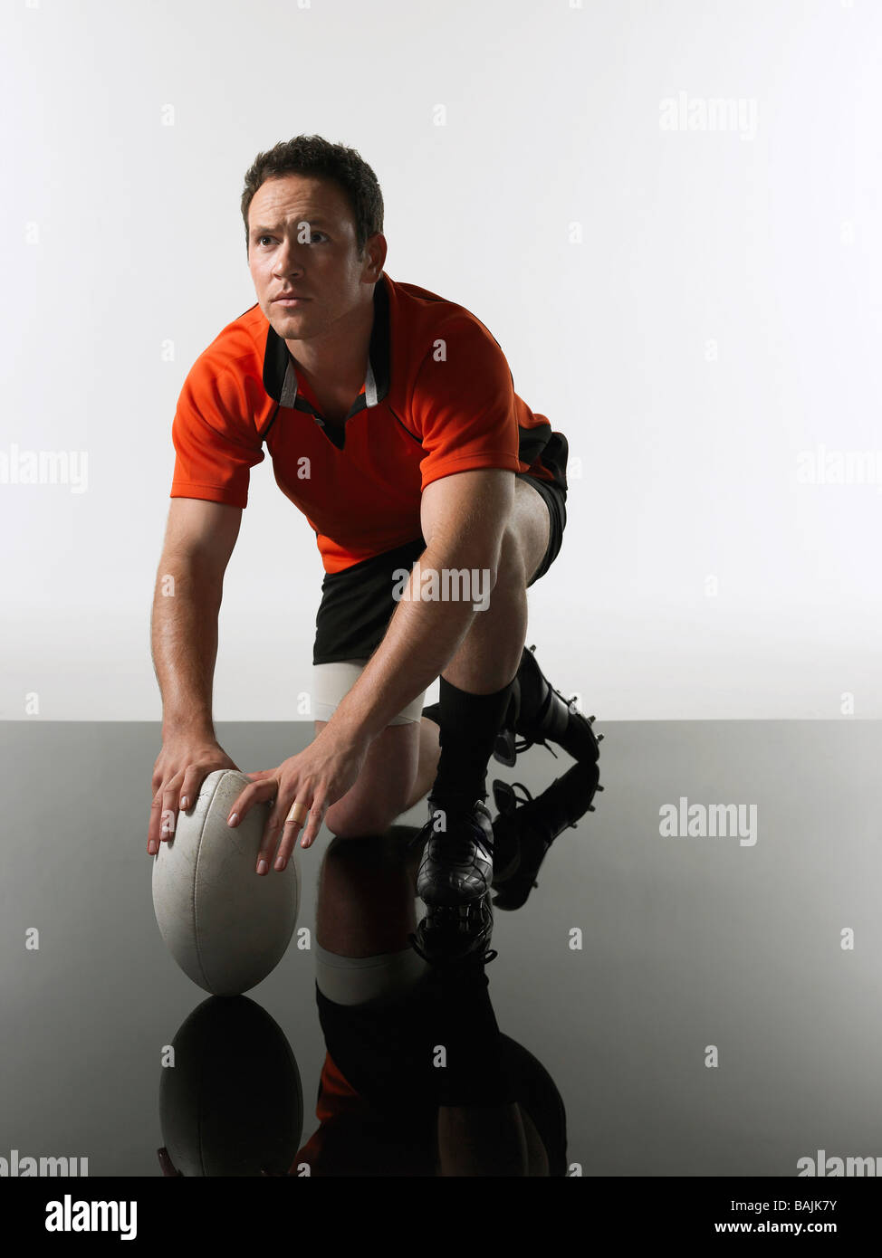 Rugby player kneeling on one knee holding ball Stock Photo - Alamy