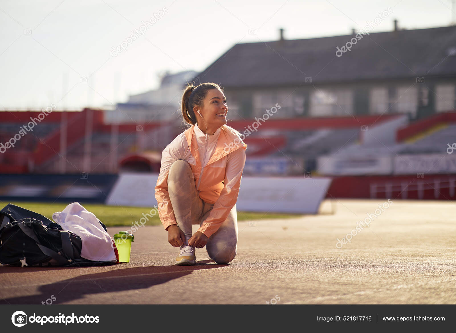 Beautiful Young Adult Caucasian Female Kneeling On One Knee At The Stadium, Tying Shoelaces, Smiling, Preparing For Training Stock Photo, Picture and Royalty Free Image. Image 176541933.