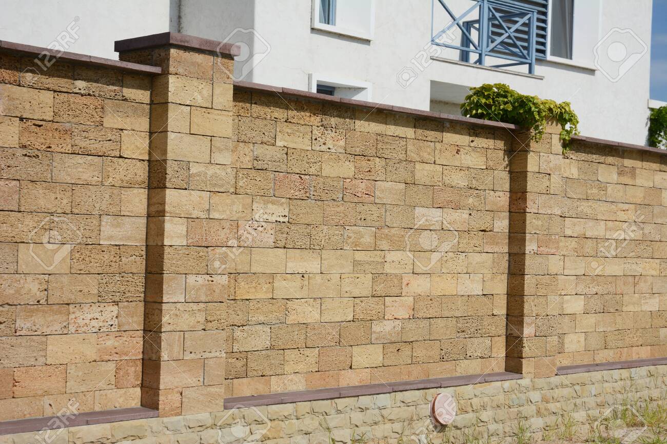 A Close-up On Brown Oyster Shell Foamed Brick, Limestone Brick Fence With Support Pillars. Фотография, картинки, изображения и сток-фотография без роялти. Image 147719047
