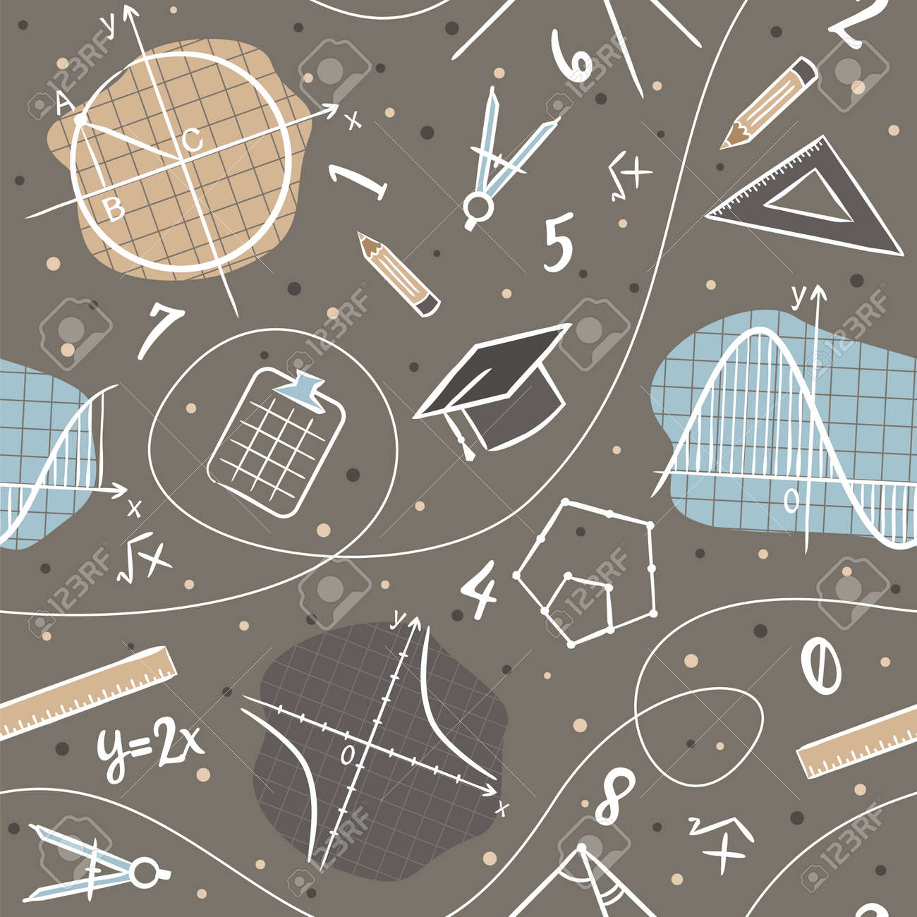 Seamless pattern with mathematical objects, graphs, triangle, Pythagorean theorem, calculator, relers, compasses . Hand-drawn color fill elements. Bright colorful vector illustration on white. Stock Vector | Adobe Stock