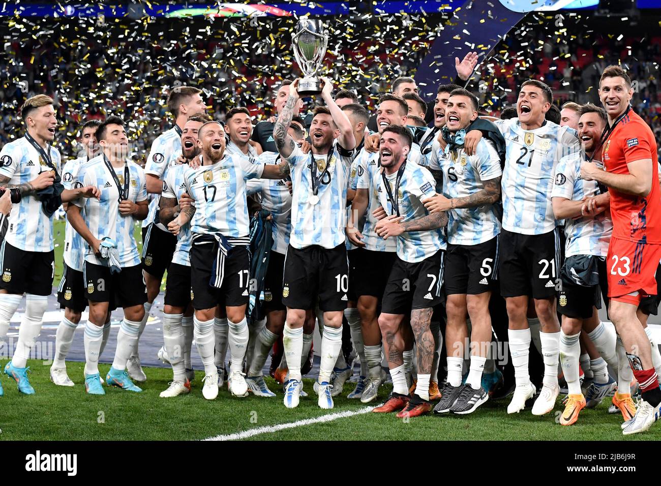 Lionel Messi of Argentina and teammates celebrate with the trophy at the end of the Finalissima trophy 2022 football match between Italy and Argentina Stock Photo - Alamy