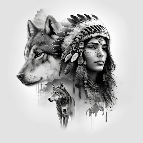 Native American Girl and Wolf Tattoo Design White Background PNG File Download High Resolution (Instant Download) - Etsy