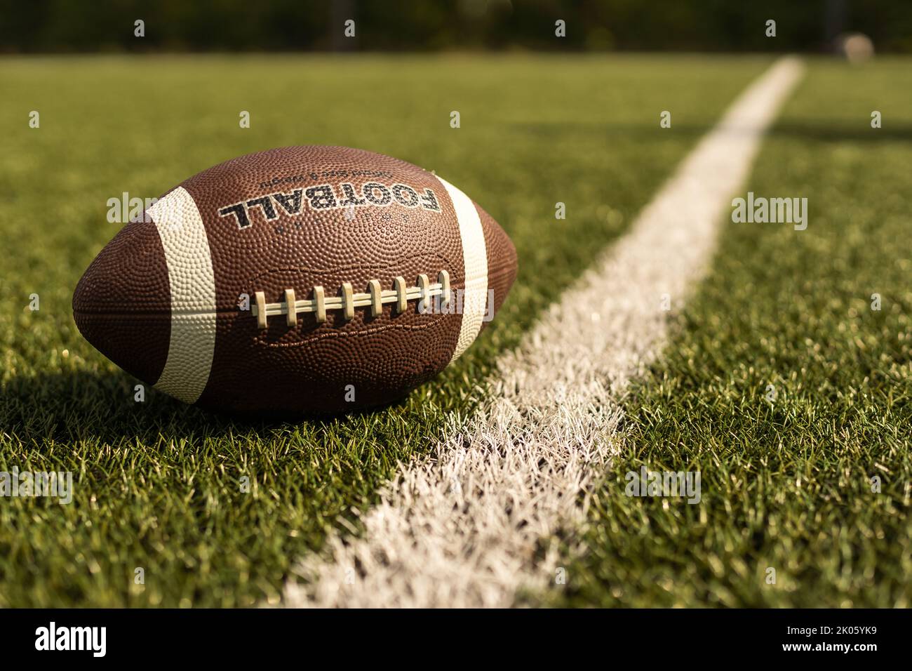 American Football On Field In Stadium With Dramatic Spot Lighting And Copy Space. Focus On Foreground Ball With Shallow Depth Of Field On Background. Фотография, картинки, изображения и сток-фотография без роялти. Image