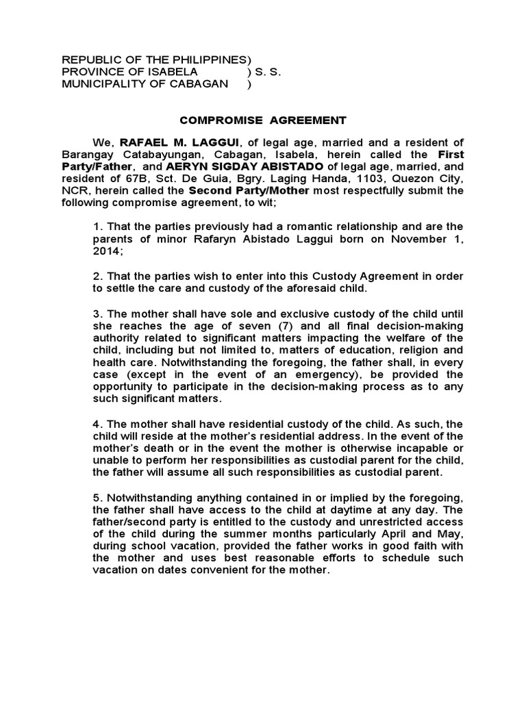 Sample Custody Agreement | Custody agreement, Parenting plan, Child custody