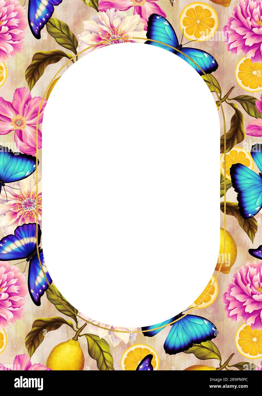 Rectangular A4 template for text with flowers, butterflies, lemons. Frame or border with floral motifs. Illustration for romantic pretty wedding invit Stock Photo - Alamy