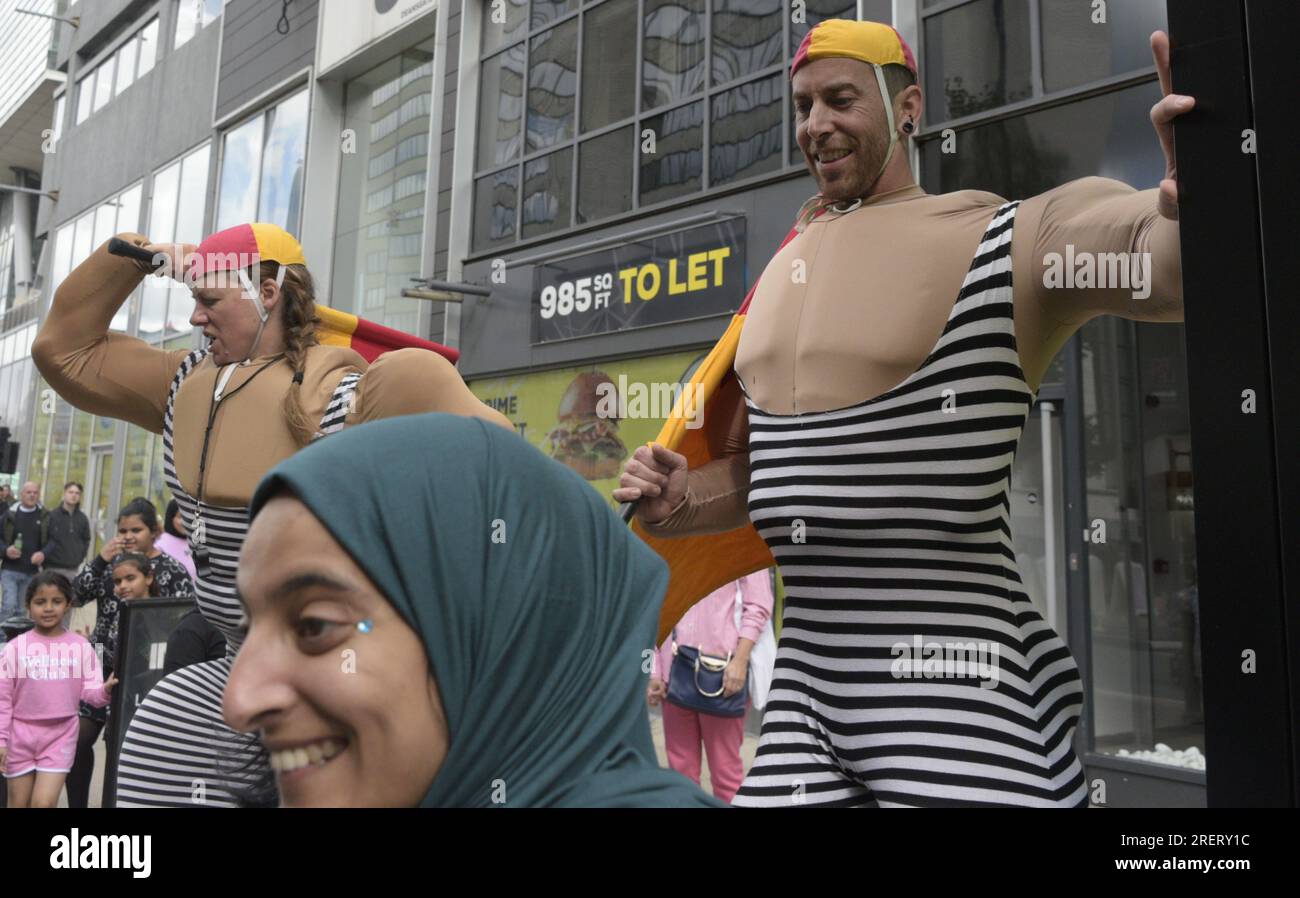 Manchester, UK, 29th July, 2023. Retro lifeguard figures, with old fashioned swimming costumes and holding flags, offer to pose with passers by to take photos and selfies on Deansgate next to the
