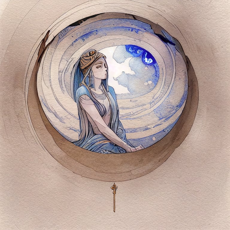 Prompthunt: drawing of a sad goddess trapped in the moon, blue eyes, lips, beautiful goddess, sad face in alhambra circle, watercolor, art nouveau, drawing Greg Rutkowski, pure white background, clear lines