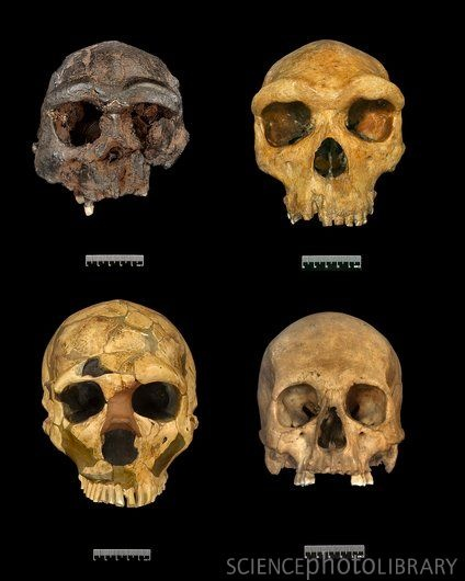 Skulls of Neanderthal, Homo erectus, Australopithecus