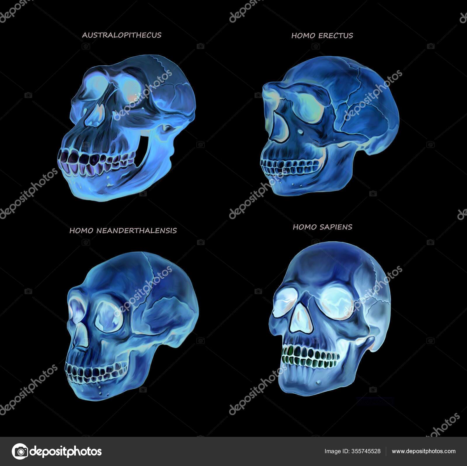 Evolution Of Human Skull ( Sahelanthropus Tchadensis . Australopithecus Africanus . Homo Erectus . Homo Neanderthalensis . Homo Sapiens ) . Stock Photo, Picture and Royalty Free Image. Image 87491769.