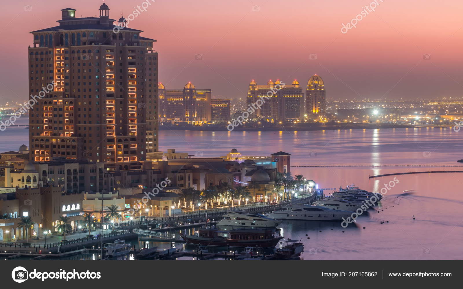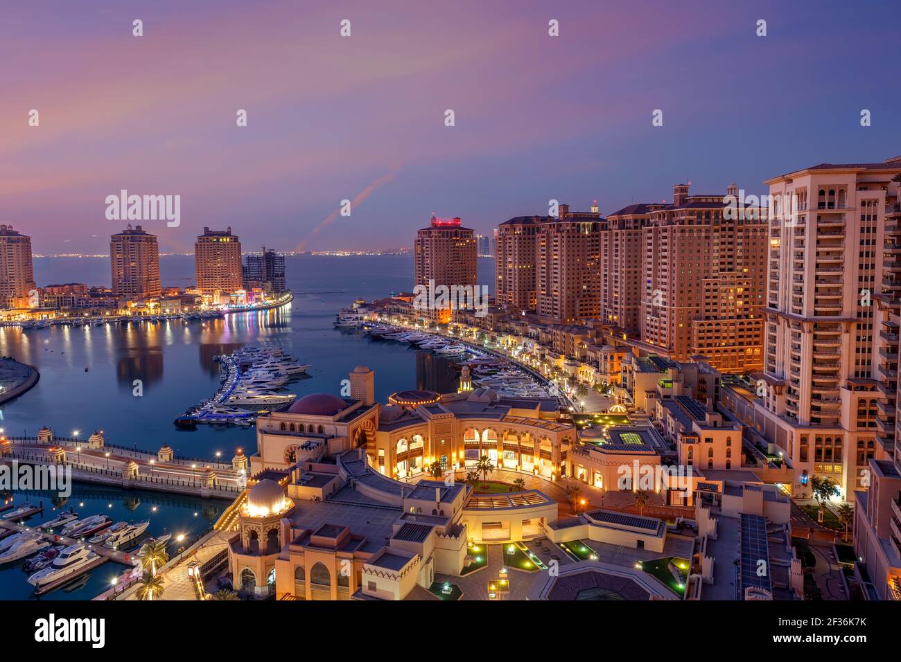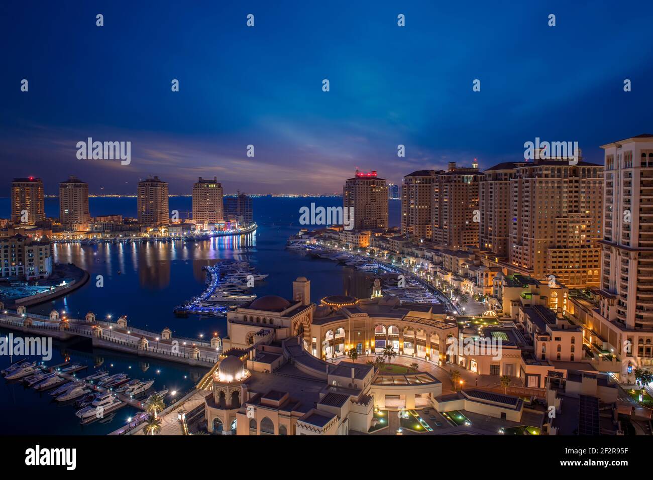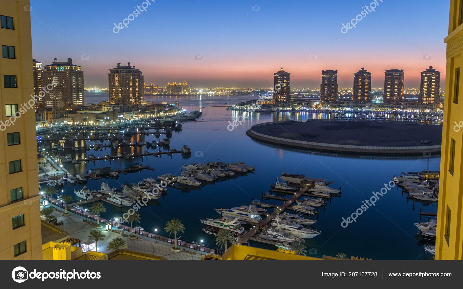 Marina corniche promenade at night in Porto Arabia at the Pearl-Qatar, residential towers and luxury boats and yachts in Persian Gulf, Doha, Qatar Stock Photo - Alamy