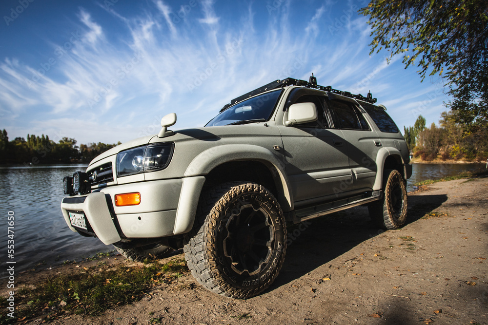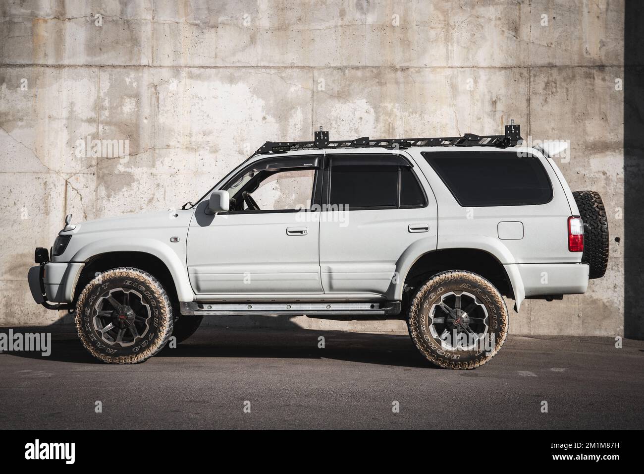 Japanese off-road used white car Toyota Hilux Surf travel on nature. Almaty, Kazakhstan - September 28, 2022 Stock Photo | Adobe Stock