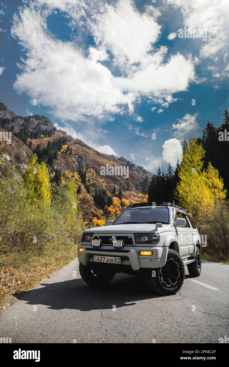 Off-road white 4x4 car Toyota Hilux Surf on autumn mountain road trip, copy space, vertical Stock Photo - Alamy