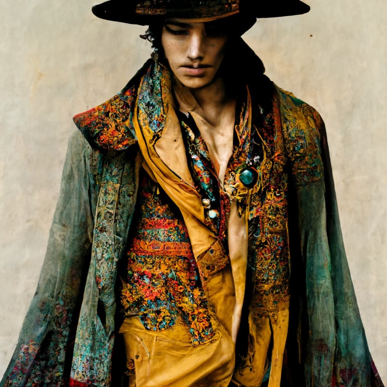 Prompthunt: Male model, bohemian style clothing, fashion photography, photos, exquisite, photography style by Mario Testino, clothing style by John Galliano, HD