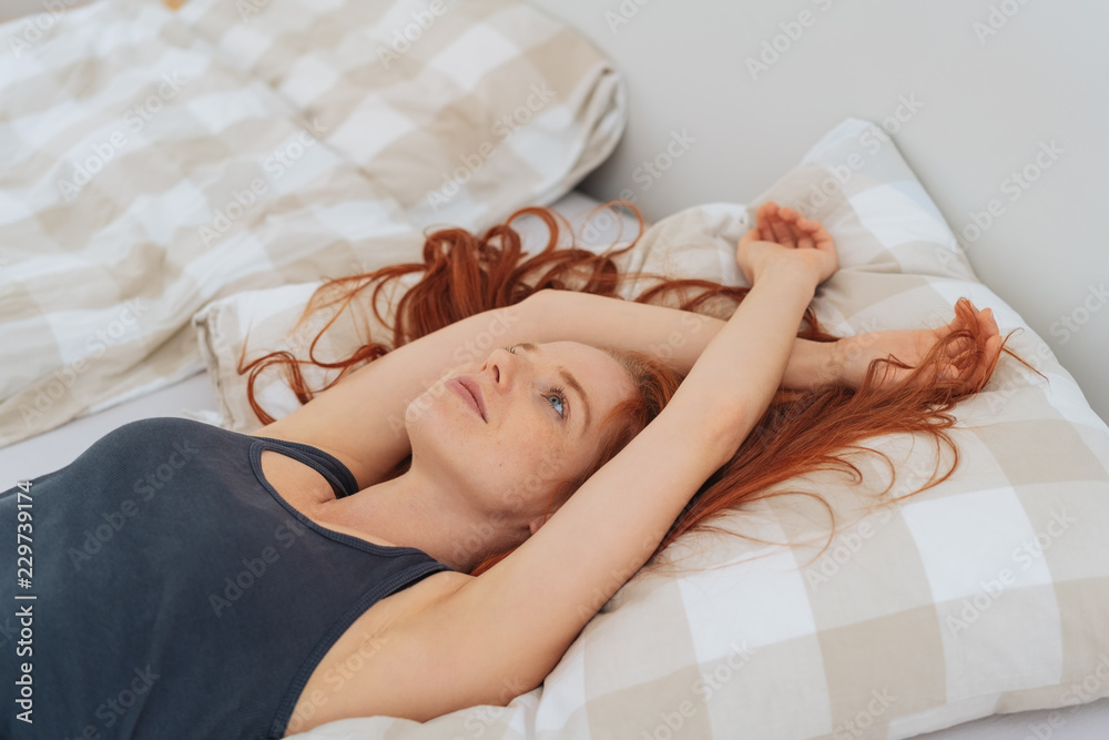 Young woman lying back relaxing on her bed Stock Photo | Adobe Stock