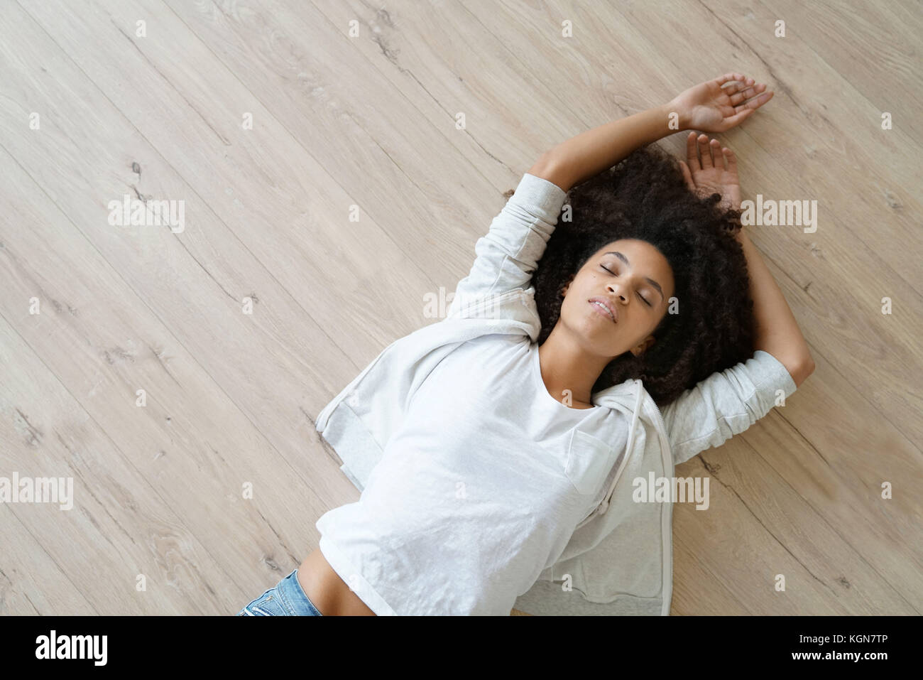Upper view of woman lying on the back on wooden floor Stock Photo - Alamy