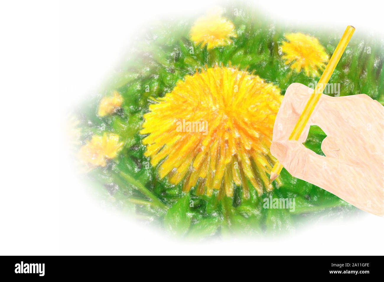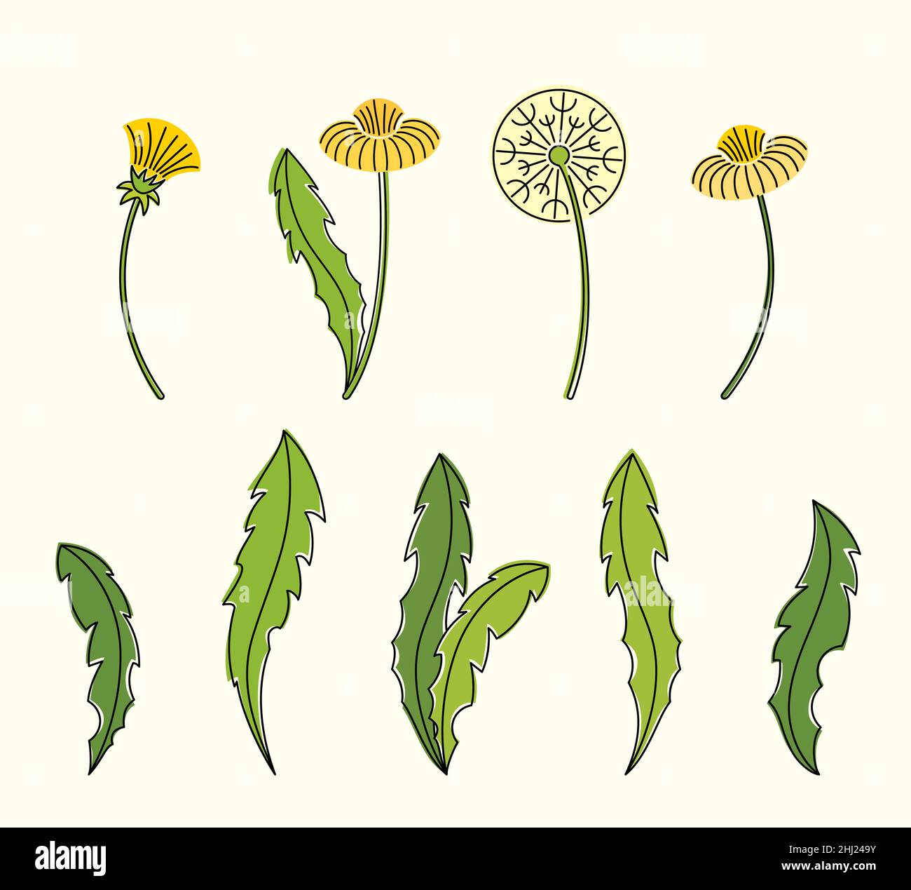 Vector Drawing Flower Of Yellow Dandelion With Green Leaves, Isolated Floral Element At White Background, Hand Drawn Illustration Royalty Free SVG, Cliparts, Vectors, and Stock Illustration. Image 146691887.