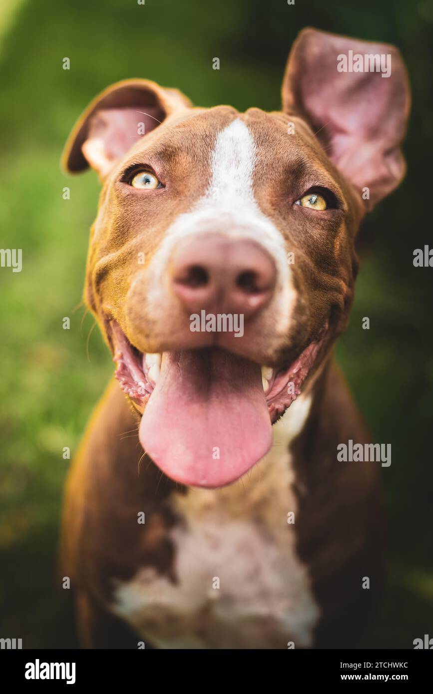 Young pitbull Staffordshire Bull Terrier in garden looks towards camera with tongue out portrait Stock Photo - Alamy