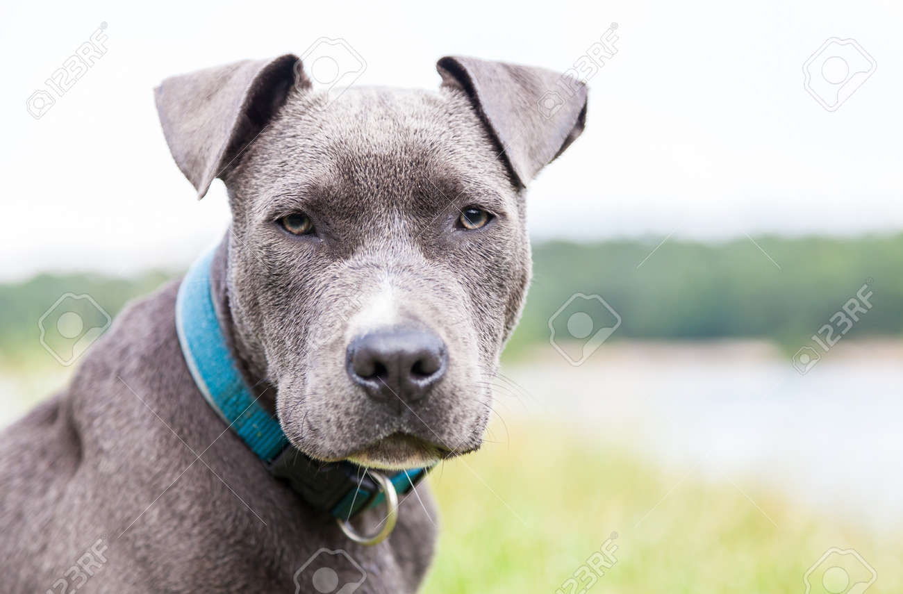 A Young Pitbull With Blue Collar Portrait Stock Photo, Picture and Royalty Free Image. Image 81645155.