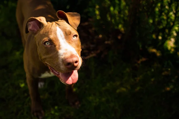 Young Pitbull Staffordshire Bull Terrier in Garden Looks Towards Camera with Tongue Out Blue Eyes Portrait Stock Photo - Image of mammal, danger: 137508914